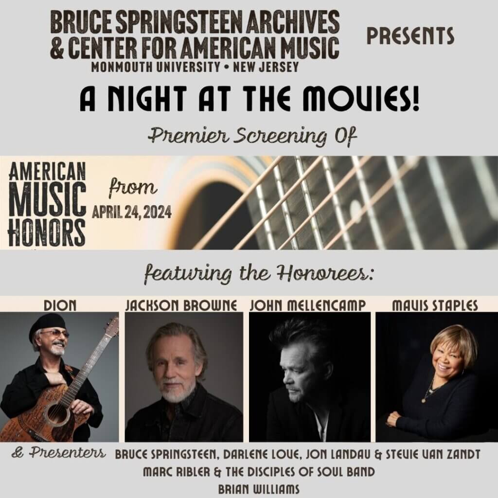 The Bruce Springsteen Archives & Center for American Music is pleased to announce the premier screening of this year’s American Music Honors. The screening of this very special evening honoring American Music icons Dion, John Mellencamp, Jackson Browne, and Mavis Staples will be held on Friday, November 1st at the intimate Pollak Theatre where the sold-out awards event was held on April 24, 2024. Doors will open at 7:30 pm.