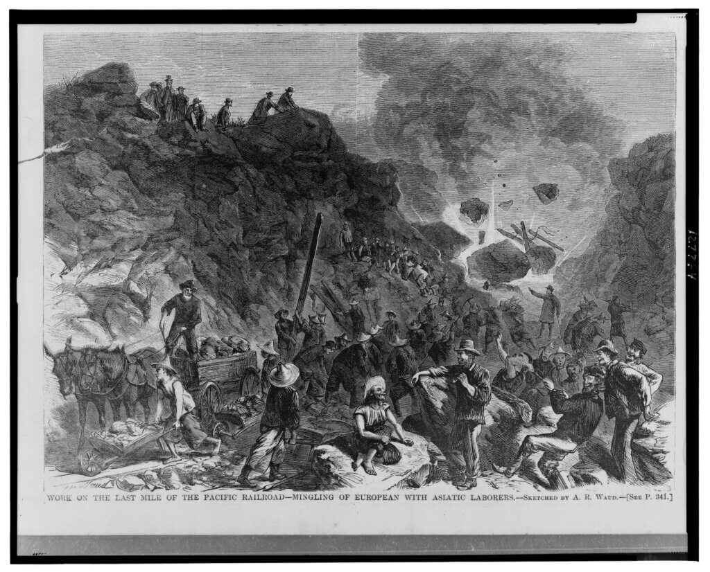 Caption reads: “Work on the last mile of the Pacific Railroad—Mingling of European with Asiatic laborers / sketched by A. R. Waud,” 1869. Courtesy Library of Congress.