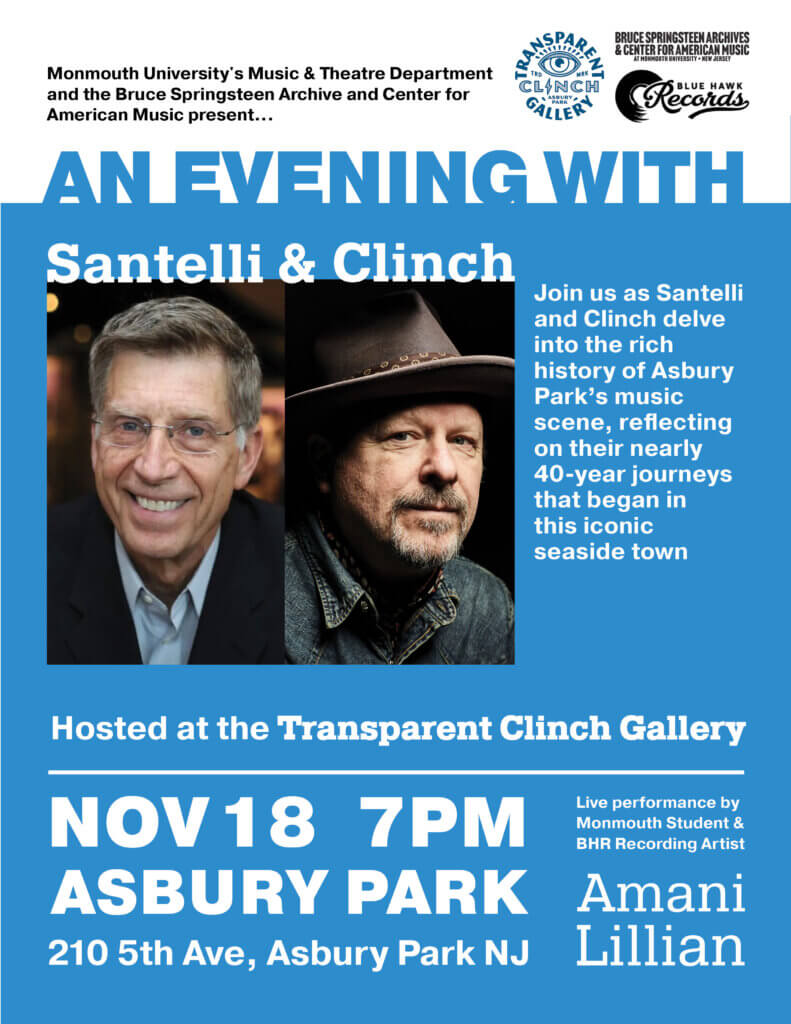 Asbury Park, NJ – Monmouth University’s Music and Theatre Department, in collaboration with the Bruce Springsteen Archives & Center for American Music, is excited to announce as entertaining and informative evening featuring a conversation between two titans of the Asbury Park music and arts scene: Bob Santelli, Executive Director of the Bruce Springsteen Archives & Center for American Music, and Danny Clinch, acclaimed photographer, filmmaker, and co-founder of Sea.Hear.Now. This special event will take place on Monday, November 18 at 7 PM at the renowned Transparent Clinch Gallery in Asbury Park, NJ. Join us as Santelli and Clinch delve into the rich history of Asbury Park’s music scene, reflecting on their nearly 40-year journeys that began in this iconic seaside town. They will share personal anecdotes and insights on how their early careers blossomed into international acclaim, while also discussing the cultural evolution of Asbury Park into a thriving hub for music and the arts. The event will also highlight some of the developments at the Bruce Springsteen Archive and Center for American Music, along with exclusive photos captured by Danny Clinch. The evening will be moderated by Joe Rapolla, Chair of the Monmouth University Music & Theatre Department and Music Industry Program Director, and will feature a special intimate live performance by Amani Lillian, student/artist on the university’s student-run record label, Blue Hawk Records. “This event not only highlights the achievements of Bob Santelli and Danny Clinch but also celebrates the transformative power of music and community,” said Rapolla. “We’re excited to work with the Bruce Springsteen Archive and Center for American Music to bring together students and the community to honor Asbury Park’s legacy.” This event is open to the public and the Monmouth University community. Seating is available on a first come, first served basis. Event Details: Date: Monday, November 18, 2024 Time: 7 PM Location: Transparent Clinch Gallery, Asbury Park, NJ